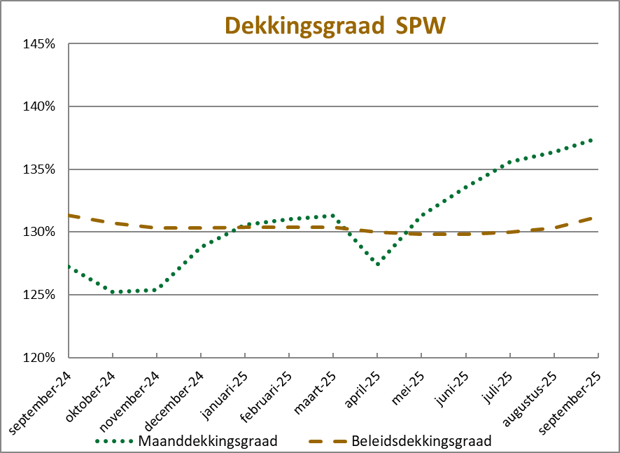 De beleidsdekkingsgraad is eind september 131,2% (eind augustus 130,3%). Door marktontwikkelingen gaat de maanddekkingsgraad van 136,4% eind augustus naar 137,5% eind september.